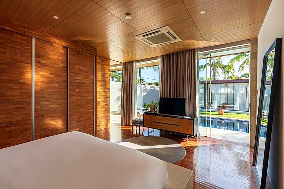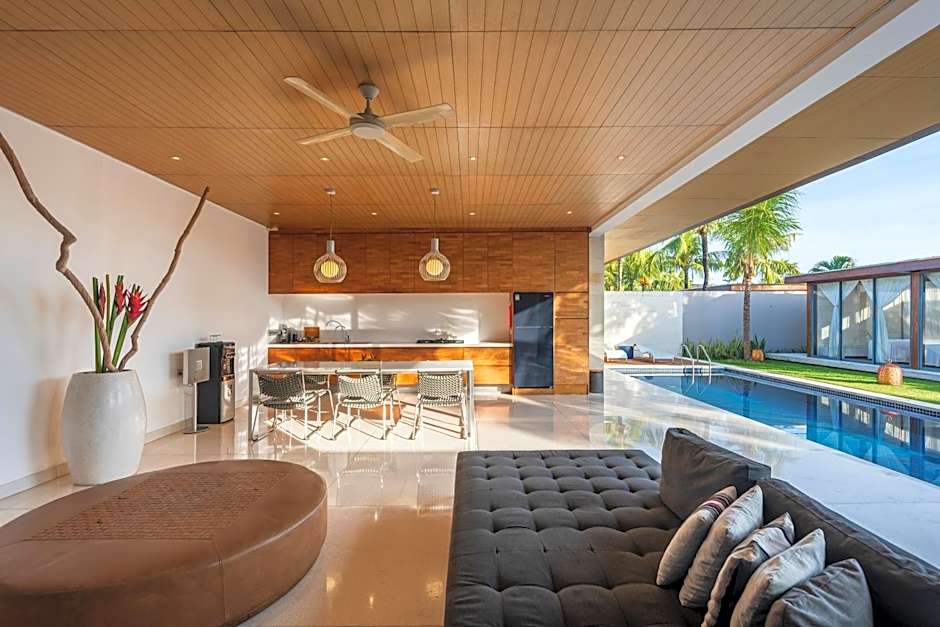 A modern, minimalist villa with a private entrance and private pool with a sundeck. The spacious kitchen comes with a stove, kitchenware and microwave oven. Large bathroom features a freestanding bathtub.